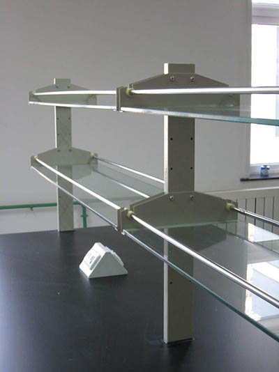 5、試劑架防落架:采用1.0mm優(yōu)質鋁合金橢圓型材,經酸洗磷化處理后噴涂環(huán)氧樹脂粉末高溫烘烤固化而成,形成通體防落架,有效防止試劑跌落,保護實驗室工作人員人身安全。